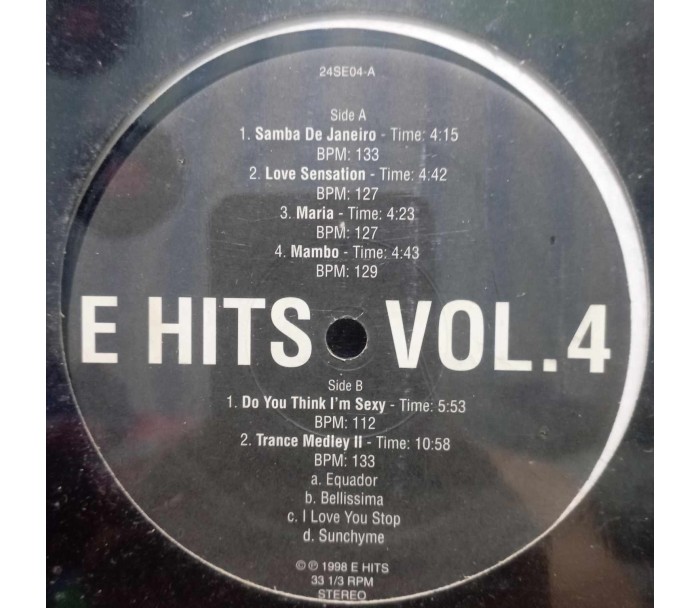 These are Limited edition DJ bootleg remixes. E-HITS VOLUME 4 1998, Housed in a plain black, and die-cut sleeve and the titles only pressed on the label itself of the actual record.